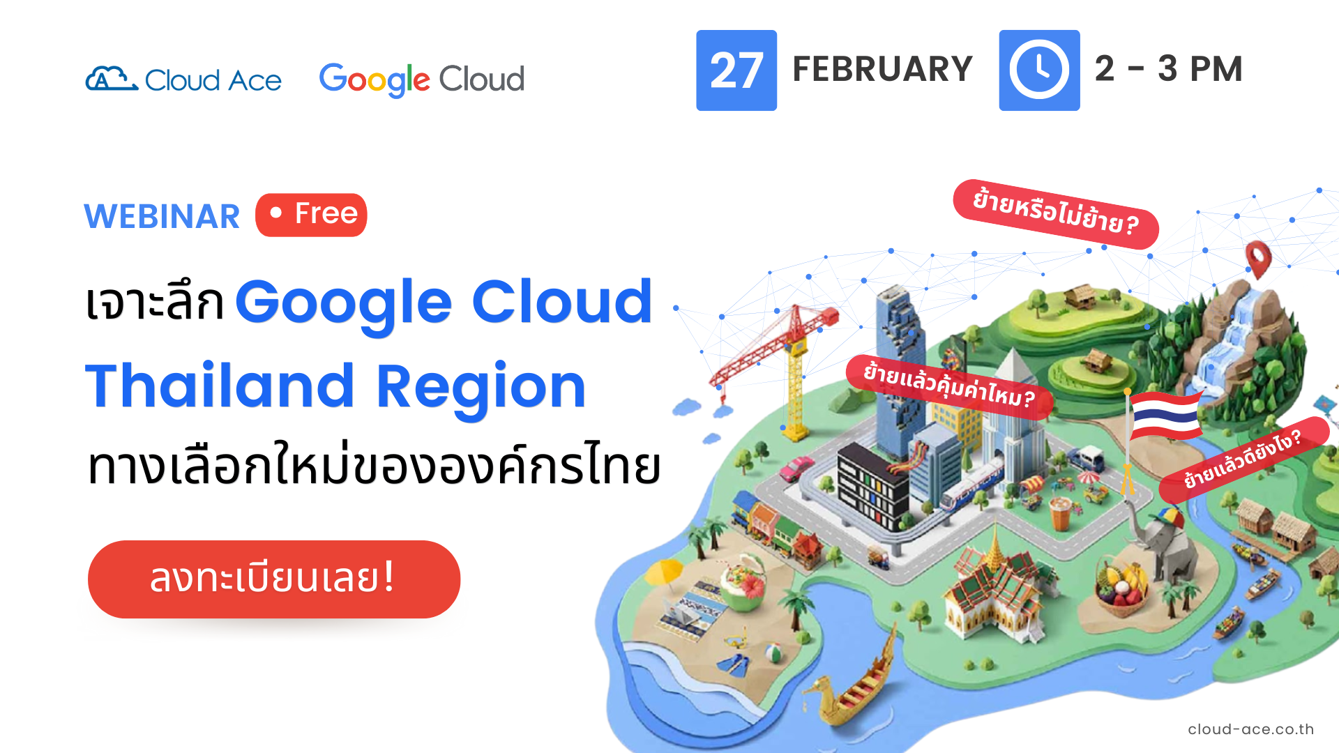 ร่วมหาคำตอบใน Webinar สุดพิเศษจาก Cloud Ace ที่จะพาคุณไปเจาะลึกทุกแง่มุมของ Thailand Region ตั้งแต่ประสิทธิภาพทางเทคนิคไปจนถึงความคุ้มค่าเชิงกลยุทธ์ เพื่อให้คุณตัดสินใจได้อย่างแม่นยำที่สุด